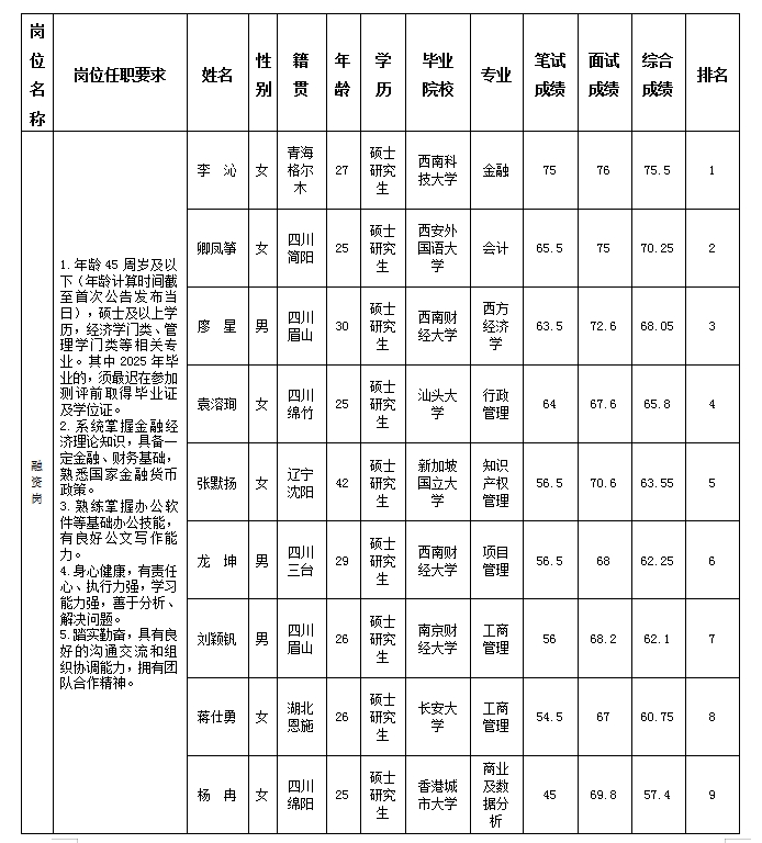 根據綿陽金控投資管理有限責任公司發(fā)布的招聘公告及招聘相關規(guī)定,經筆試、面試等程序,現將筆試(面試)成績予以公示。