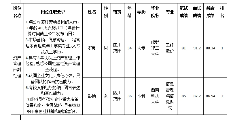根據(jù)綿陽市綿投商業(yè)運(yùn)營管理有限責(zé)任公司發(fā)布的競(jìng)聘公告及競(jìng)聘相關(guān)規(guī)定,經(jīng)筆試、面試等程序,現(xiàn)將筆試(面試)成績(jī)予以公示。