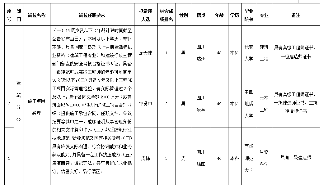 根據四川嘉來建筑工程有限公司發(fā)布的招聘公告及招聘相關規(guī)定,經筆試、面試、考察、體檢等程序,擬錄用龍?zhí)旖?、鄒賢中、周棟同志到四川嘉來建筑工程有限公司工作,現(xiàn)予以公示,具體情況如下: