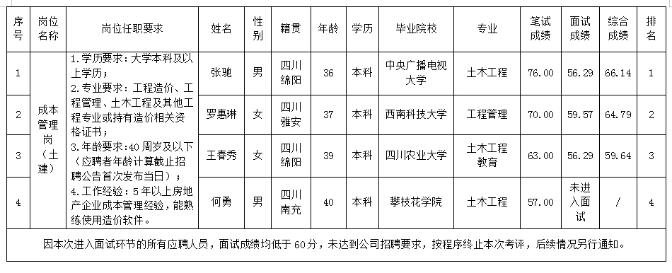 根據(jù)綿陽市綿投置地有限公司發(fā)布的招聘公告及招聘相關(guān)規(guī)定,經(jīng)筆試、面試等程序,現(xiàn)將筆試、面試成績予以公示。